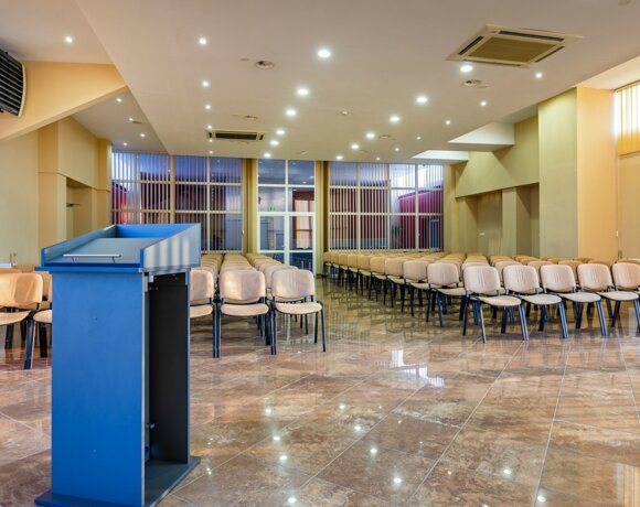 Sala lustrzana idealna do organizacji konferencji, szkoleń, pokazów oraz imprez okolicznościowych. Istnieje możliwość zaciemnienia sali.